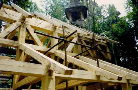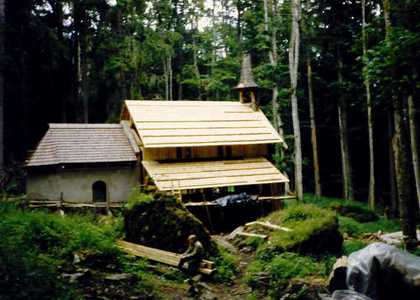 Konstruktion der Stirnfront - das andere ist alles neu. Das Dach ist mit Schindeln gedeckt. Von dem ursprünglichen Bau der Kapelle ist es mir gelungen, ein Brett mit alten Aufschriften und Unterschriften von Einwohnern aus Wallern und Umgebung sicherzustellen. |