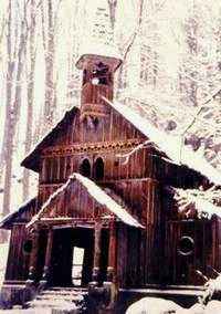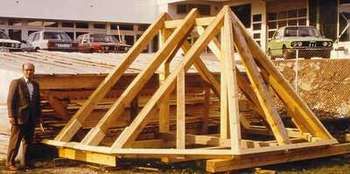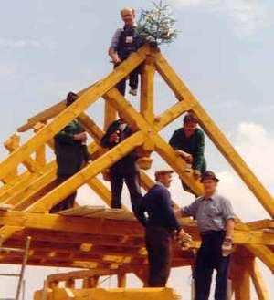 | Schon am gleichen Morgen wurde, da Grundfest und Sockel bereits fertig waren, mit dem Aufrichten begonnen, und schon binnen zwei Tagen stand ein Großteil des Holzfachwerkes. Vor lauter Eifer beim Aufrichten waren von mir die Sicherheitsmaßnahmen etwas vernachlässigt worden, und so war es wie ein erneutes Wunder der Gnadenmutter vom Tussetberg, dass, als uns die Vorderwand einstürzte, keiner von uns zu Schaden kam. Nicht einmal die Wand selbst hatte einen Schaden abbekommen. Nach vier Wochen harter Arbeit war man froh, dass der Holzbau der neuen Kapelle bis auf einige kleinere Arbeiten fertiggestellt war. | ![]() |