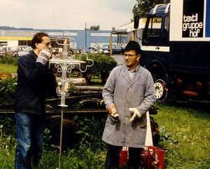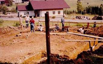 | Dass alles so reibungslos abgelaufen war, haben wir vor allem Bürgermeister Damasko zu verdanken, der mich und Gustl Tahedl beherbergte, und der viel für den reibungslosen Arbeitsverlauf organisierte. Strom wurde uns von den Nachbarn Friedsam und Stumvoll zur Verfügung gestellt; die naheliegende Schreinerei Springer durften wir jederzeit benützen. Auch Pfarrer Max Richtsfeld trug zum Gelingen unseres Vorhabens bei, denn er gab seinen geistlichen Segen dazu und hatte für seine durstigen Seelen immer ein Tragerl Bier übrig. Die Gemeindearbeiter standen uns jederzeit zur Verfügung. | |