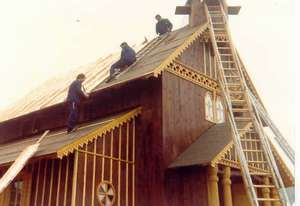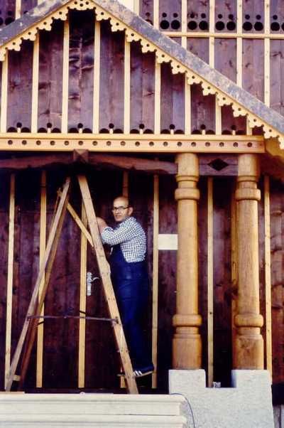 sowie die Holzverzierungen des Innenraumes fertiggestellt. (Emil Weber vor dem Winterlager, vorne Dachsparren der Steinkapelle) |