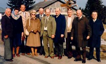 Gemeindebetreuung von Obermoldau mit dem 1. Bür- germeister Otto Damasko in Philippsreut und Besichtigung des ersten Grundstückes. Von links nach rechts: Josef Gubisch mit Frau (Brettschneider Annerl), Mitterberg; Walter Faschingbauer, Wolfsgrub; Frieda Baier (Wawei Frieda), Birkenhaid; Walter Michetschläger, Filz; Emil Weber, Elendbachl; Bürgermeister Otto Damasko, Philippsreut; Franz Dietl, Eleonorenhain; Franz Häusl, Obermoldau; Albert Robl, Kubohütten |