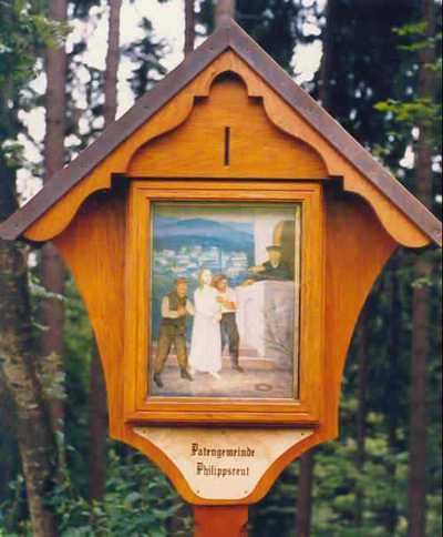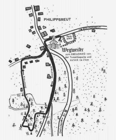 Nach verschiedenen Vorschlägen und gescheiterten Versuchen, den Kreuzweg von der Grenze her zur Kapelle zu leiten, hat die Gemeinde Philippsreut durch die tatkräftige Unterstützung ihres Bürgermeisters Otto Damasko das Aufstellen der Stationen auf Privatgrund in einem weiten Bogen über dem Dorf gestattet. Aber gerade durch diese Höhenlage am Waldrand mit dem Fernblick auf den Böhmerwald jenseits der Grenze gewann der nachgestaltete Leidensweg des Herrn an sinnentsprechender Aussagekraft. |