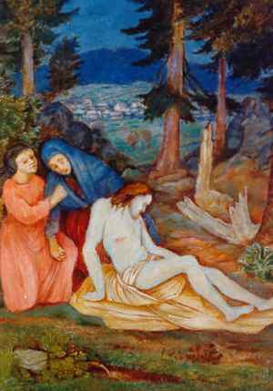 | Im Vordergrund sprudelt eine Waldquelle, wie sie einst dem Pfarrdorf Böhmisch Röhren den Namen gab. Ein klarer Quell der Erquickung für die Menschen, ein heilendes Wasser, mit dem auch die Wunden Jesu gewaschen wurden! Einst sprudelte ein Quell der Gnade auch bei der alten Tussetkapelle. | Er wurde in ein Felsengrab gelegt. So duckt sich auch die Kapelle vor den Felsentürmen des Berges. Maria hat für Ihren toten Sohn eine Rose in der Hand - rot leuchtet dieses Symbol der Hoffnung als Sieg über den Tod. Hoffnungsvoll steht das Morgenlicht der Auferstehung über dem Tussetwald. |