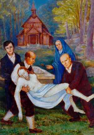 | Wo kommt er her, dieser Helfer? Kam er vom Tussetberg herunter - über die Guthauser Wiesen bis zum Ufer der jungen, plätschernden Moldau bei der Säumerbrücke? Wie eine Gürtelschnur zieht auf dem Bild die Häuserreihe von Guthausen durch den Waldmantel des Tussetberges. | Sie trägt die Böhmerwaldtracht, die Frau aus Humwald. Wie sie von der früheren Häuserreihe des Dorfplatzes quer über den Vorplatz der Ortskapelle mutig zu Hilfe eilt, spürt man die alte Hilfsbereitschaft dieser vertriebenen Dorfgemeinschaft. |