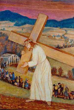 | Jedes Bild zeigt im Hintergrund Motive des Stifterortes. Der Leidensweg Christi wird so zu einem symbolhaften Zug durch die Fluren jenseits der Grenze. Die Künstlerin verstand es meisterhaft, das Heilsgeschehen mit dem Schicksalsweg der Böhmerwäldler in den letzten Jahrzehnten zu verknüpfen und religiöses Empfinden wachzurufen. |